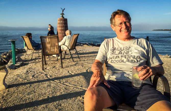 Sometimes you have to get creative with storage space on a Ranger Tug. Jim decided one day that the bar was going to reside in the starboard side cockpit corner. Works for me! We saw lots of interesting things while staying in Marathon. The sun goddess wishing pond (above right) and the coconut cocktail holder (below left) are just a few.