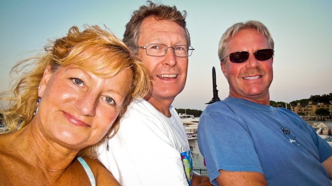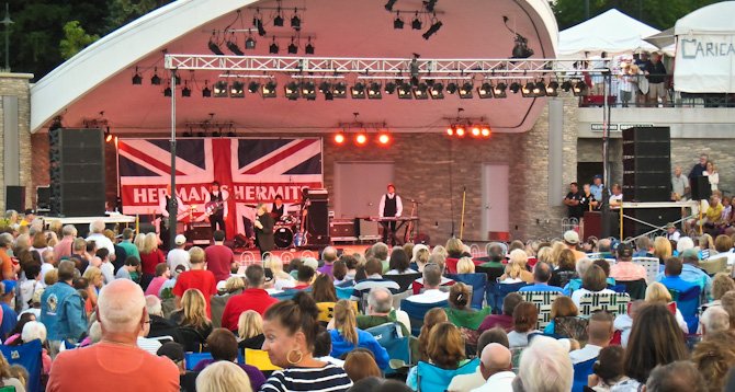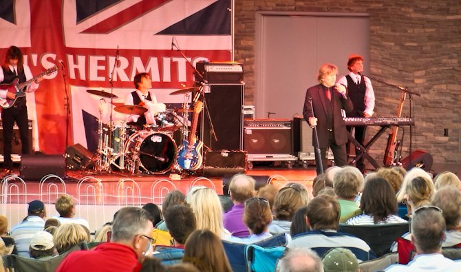 The Friday night band was none other than Herman’s Hermits. We enjoyed the old hits and Peter Noone’s humorous side. We listened to the concert while sitting on top of one of the statues in the park with friends, Denise (below-left) and Jeff (below-right).