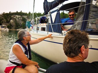 Doubling our pleasure comes to mind when we think of our visit to Covered Portage Cove in the North Channel. Not only was it our first time anchoring in this cove, but we also had the pleasure of rendezvousing with friends Charlie and Linda on Freedom’s Turn (above). We met them in 2008 while doing our second Great Loop boat trip and cruised several times together, including a trip to Chattanooga and even the Bahamas. With a lot of shared cruising experiences in common, we were excited for the reunion in Covered Portage Cove. We got there one day earlier, so we were ready to enjoy their company once they got there.