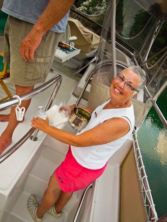 We got in our dingys during cocktail hour to visit some of the neighboring boats in the cove before we met for dinner on Freedom’s Turn. Making the rounds in a harbor like this by dinghy is a great way to meet other boaters.