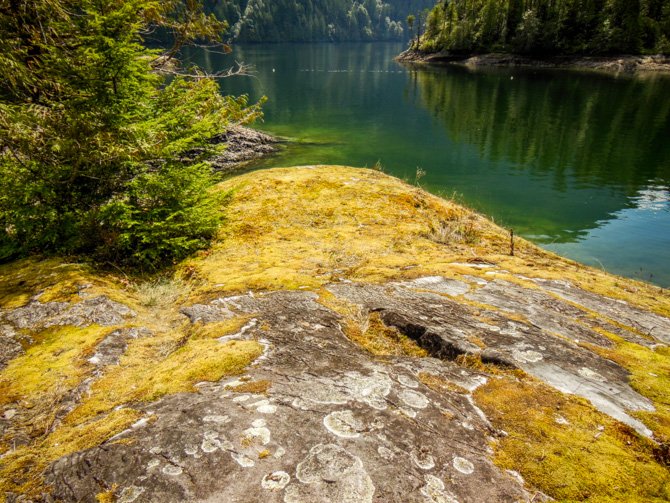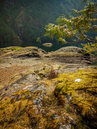 We stopped at this dock located at an anchorage spot, the golden mossy boulders stood out in great contrast to the surrounding forest, water, and sky.