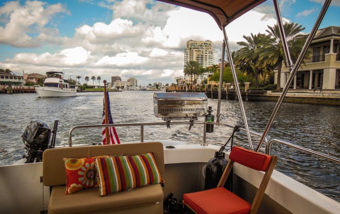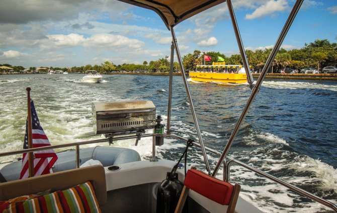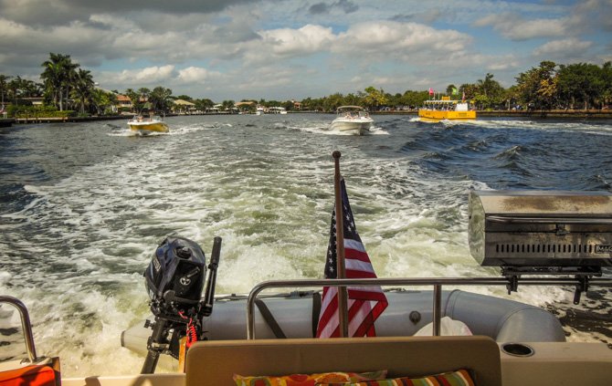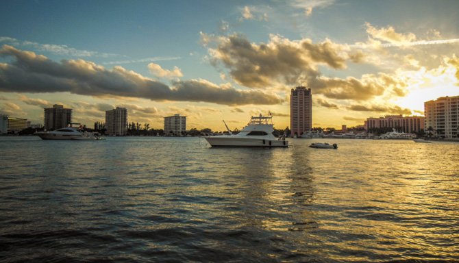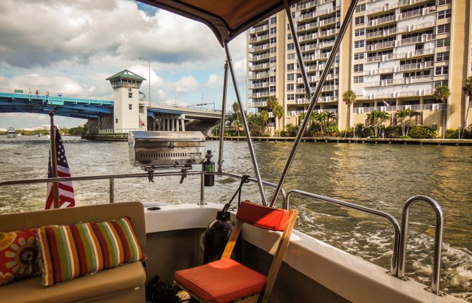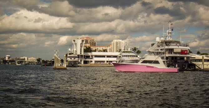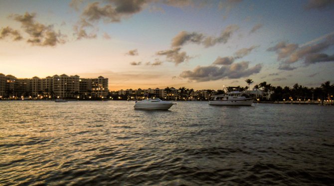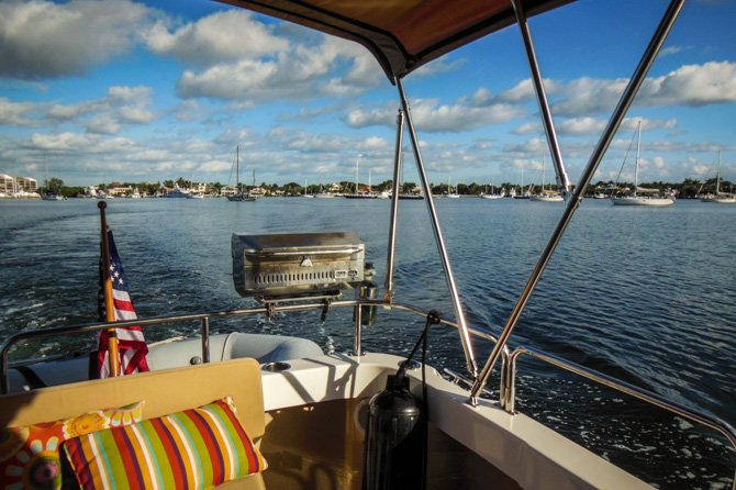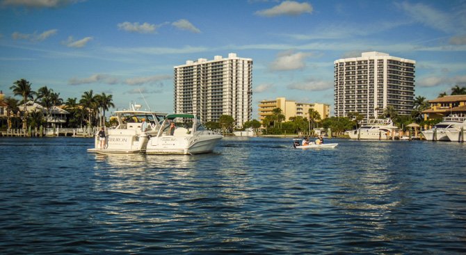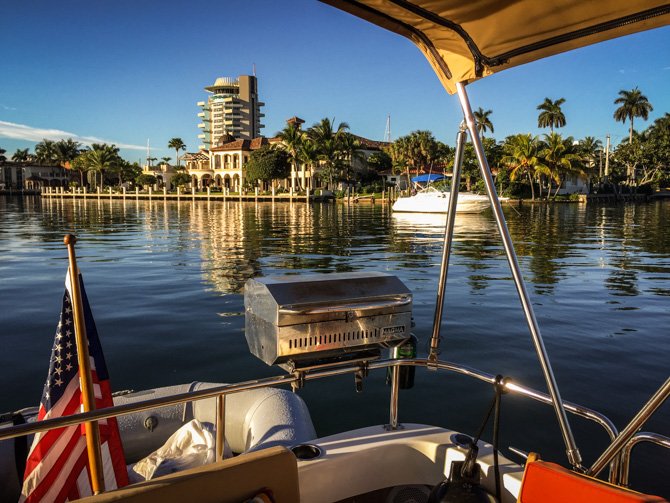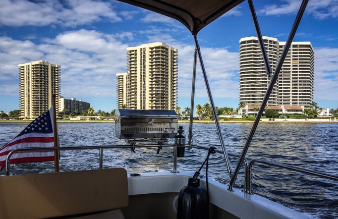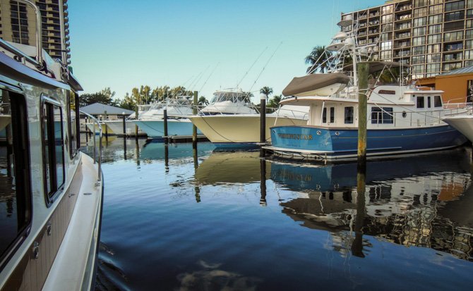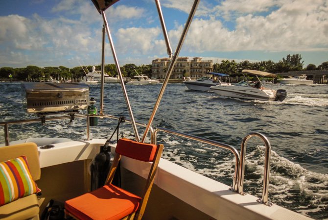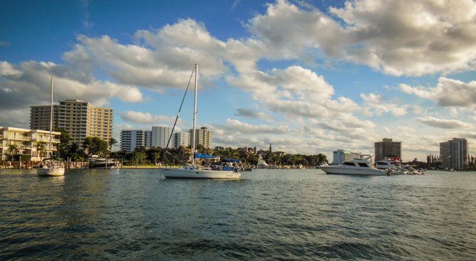 Thirty-four more miles, still moving south towards Fort Lauderdale the following day, found us at Lake Boca Raton. My research showed that Lake Boca Raton is a nice little anchorage, it typically has only four or five boats anchored overnight. Like Peck Lake, Lake Boca Raton is an indentation off of the ICW except there is an inlet to the Ocean here. When we arrived, much to our surprise, the cove-sized Lake was filled almost to capacity with anchored party boats, it was a perfect sunny Saturday afternoon and everyone who had a boat seemed to have migrated to Lake Boca Raton. We found a spot to drop our hook and settled in for a very entertaining afternoon and early evening. By nightfall nearly everyone had pulled anchor to go home – in the end, there was only a handful of boats anchored with us for the night.
