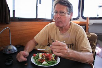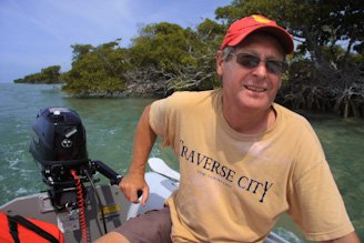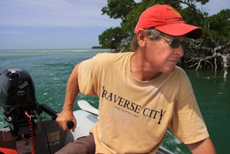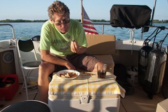 For a short bit, were escorted by a school of dolphins who were playing tag around our boat in the white sand-bottomed crystal clear waters of the Keys.